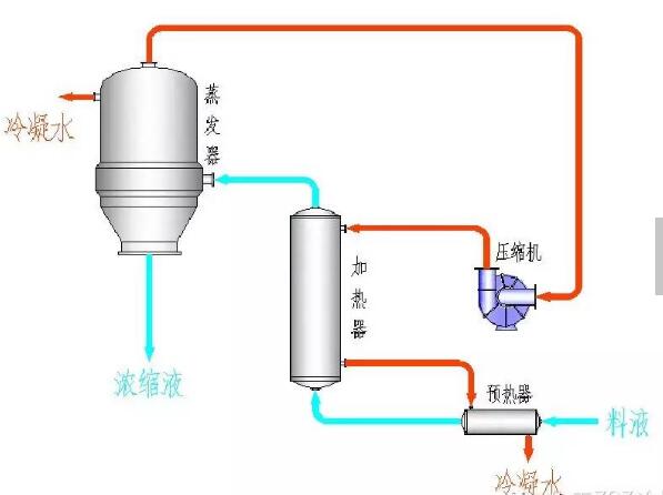 MVR蒸發(fā)器其工作過程是低溫位的蒸汽經(jīng)壓縮機(jī)壓縮,溫度、壓力提高,熱焓增加,然后進(jìn)入換熱器冷凝,以充分利用蒸汽的潛熱。除開車啟動外,整個蒸發(fā)過程中無需生蒸汽。除開車啟動外,整個蒸發(fā)過程中無需生蒸汽從蒸發(fā)器出來的二次蒸汽,經(jīng)壓縮機(jī)壓縮,壓力、溫度升高,熱焓增加,然后送到蒸發(fā)器的加熱室當(dāng)作加熱蒸汽使用,使料液維持沸騰狀態(tài),而加熱蒸汽本身則冷凝成水。這樣原來要廢棄的蒸汽就得到充分的利用,回收潛熱,提高熱效率,生蒸汽的經(jīng)濟(jì)性相當(dāng)于多效蒸發(fā)的30效。其中為使蒸發(fā)裝置的制造盡可能簡單和操作方便,可使用離心式壓縮機(jī)、羅茨式壓縮機(jī)。這些機(jī)器在1:1.2到1:2壓縮比范圍內(nèi)其體積流量較高。